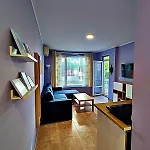 Varje rum har uteplats, balkong och soffa tillsammans med mikrovågsugn, vattenkokare och kylskåp i en kokvrå. Lägenheten består av 1 sovrum och 1 badrum med separat toalett och dusch.